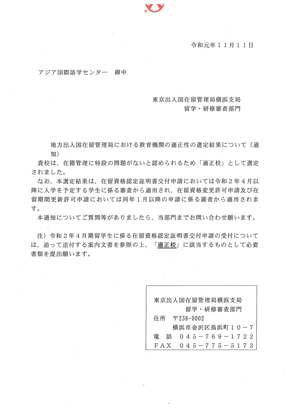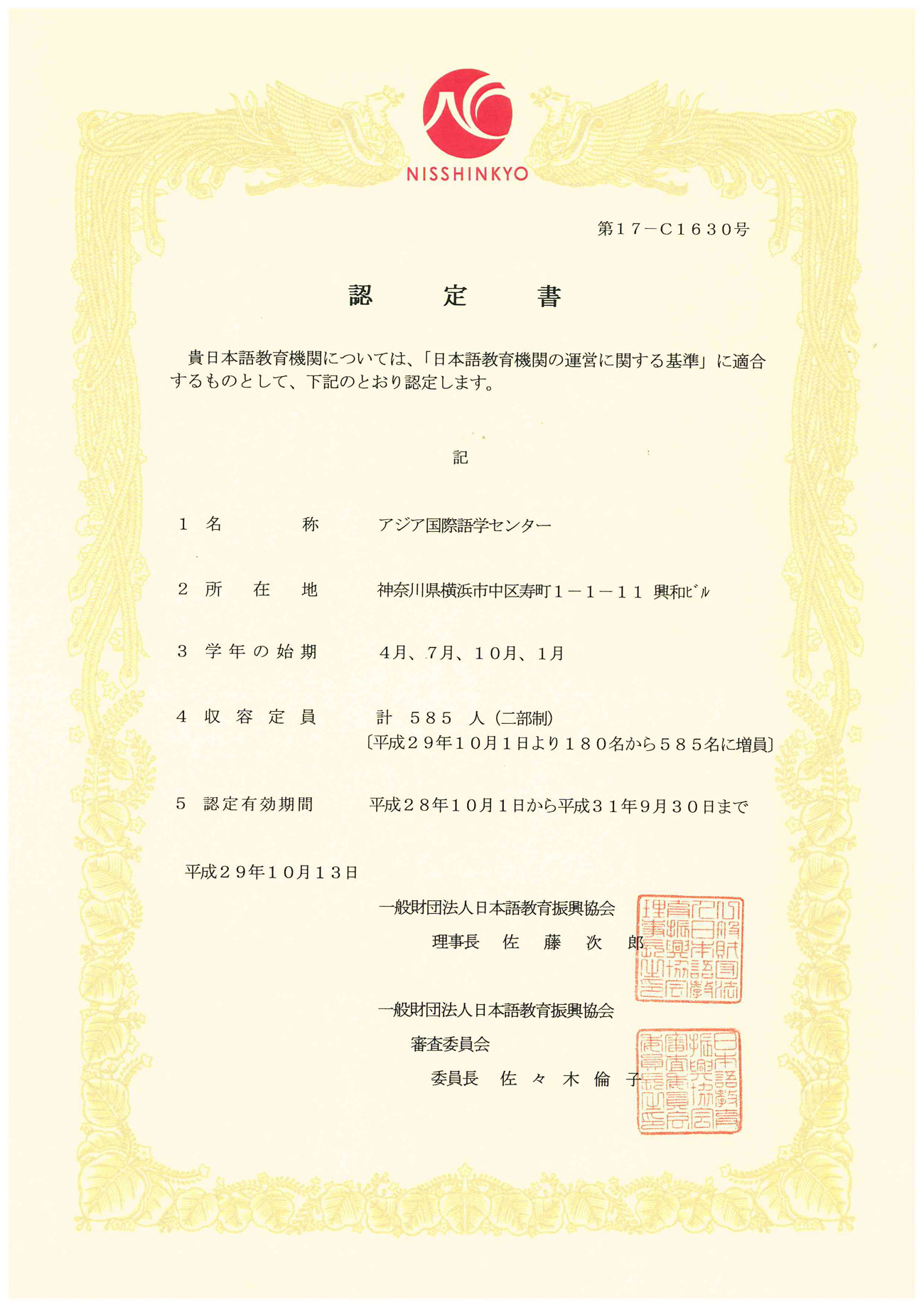 - Designated as a proper school by the Tokyo Immigration Bureau